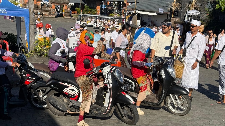 Sistem antrean juga diberlakukan agar tidak terjadi perebutan penumpang di lapangan. Motor para tukang ojek tampak berjejer rapi menunggu giliran, sehingga menciptakan suasana yang lebih tertib bagi wisatawan maupun umat yang hadir.