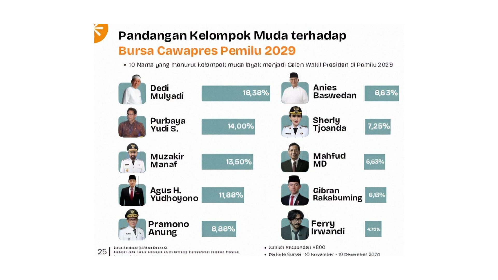 Nama Kang Dedi Mulyadi (KDM) memimpin sementara dengan elektabilitas 18,38 persen, disusul Purbaya Yudi Sadewa sebesar 14 persen dan Muzakir Manaf dengan 13,5 persen. Di bawahnya, terdapat Agus Harimurti Yudhoyono (AHY) yang mengantongi 11,88 persen.