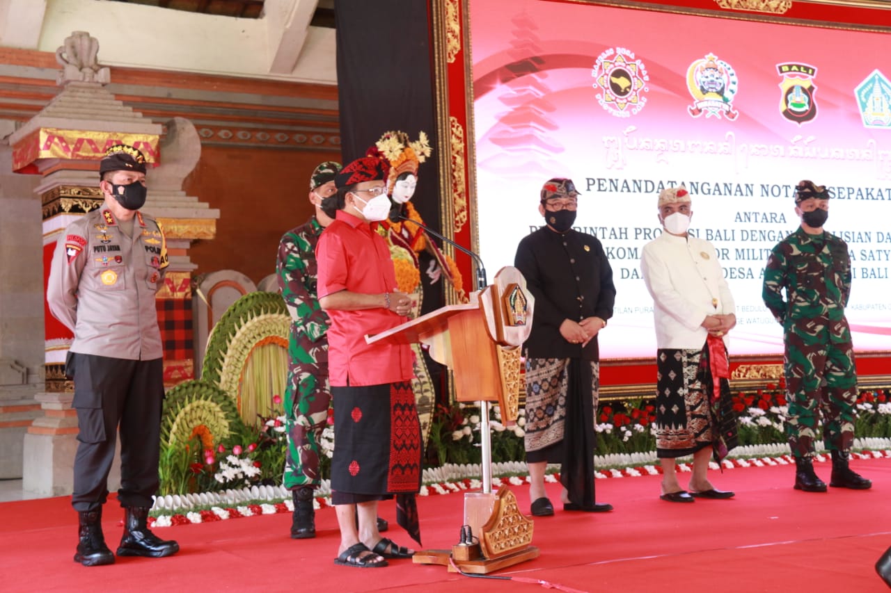 GIANYAR,BALIPUSTAKANEWS – Gubernur Bali, Wayan Koster, Kapolda Bali, Irjen Pol Putu Jayan Danu Putra, Danrem 163/Wira Satya, Brigjen TNI Husein Sagaf, dan Bendesa Agung MDA Provinsi Bali, Ida Pangelingsir Agung Putra Sukahet secara resmi menandatangani Nota Kesepakatan Bersama tentang Pelaksanaan Sistem Pengamanan Lingkungan Terpadu Berbasis Desa Adat (Sipandu Beradat) tepat pada Purnama Kaulu, hari Kamis, Wraspati Wage Watugunung (28/1) pagi di Wantilan Pura Samuan Tiga, Desa Bedulu, Kecamatan Blahbatuh, Kabupaten Gianyar.