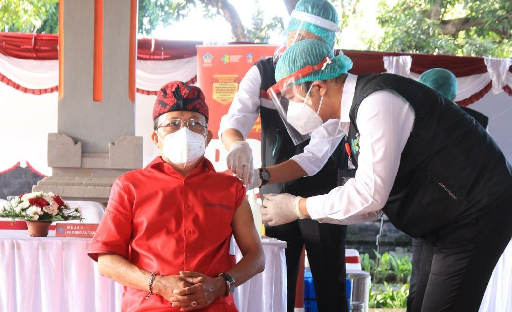 Dengan menggunakan pakaian adat Bali, penyuntikan vaksin di bagian lengan kiri orang nomor satu di Pemerintah Provinsi Bali ini (Gubernur Bali, Wayan Koster, red) dilakukan langsung oleh dr. Putu Gede Surya Wibawa, M.Biomed, Sp.PD yang merupakan salah satu dokter penyakit dalam di Rumah Sakit Bali Mandara (RSBM).