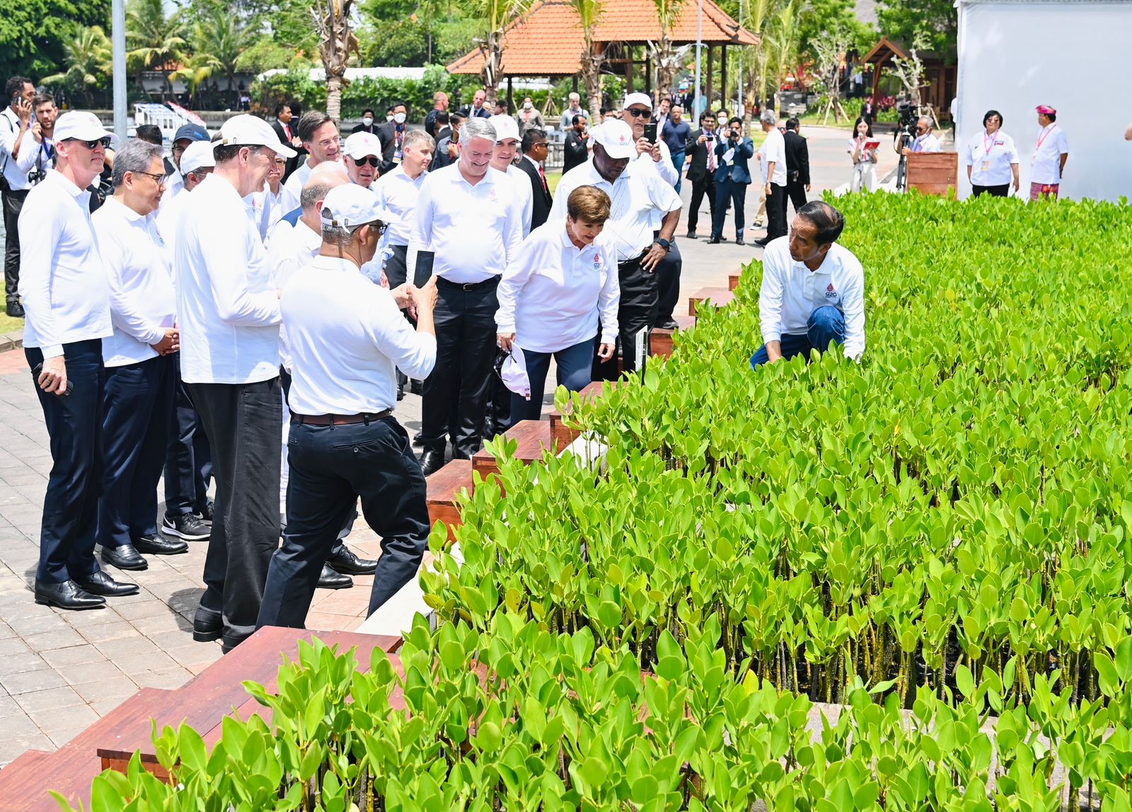 BALIPUSTAKANEWS, DENPASAR – Mengawali rangkaian kegiatan Presidensi G20 hari kedua, Presiden Joko Widodo mengajak para pemimpin negara G20 dan lembaga internasional mengunjungi Taman Hutan Raya (Tahura) Ngurah Rai, Kota Denpasar, Provinsi Bali, pada Rabu, 16 November 2022. Didampingi Gubernur Bali, Wayan Koster, Presiden dan para pemimpin G20 melakukan penanaman pohon mangrove bersama serta berkeliling melihat langsung berbagai spesies mangrove yang ada di Tahura.