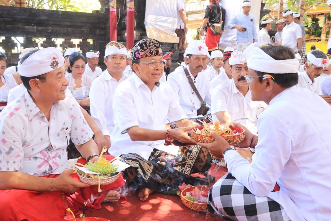 BALIPUSTAKANEWS, KARANGASEM – Gubernur Bali, Wayan Koster yang didampingi oleh Bupati Karangasem, Gede Dana menghaturkan sembah bhakti pada Upacara Ngusaba Ageng di Pura Puseh Desa Adat Datah, Kecamatan Abang, Kabupaten Karangasem pada Minggu, 11 Desember 2022.