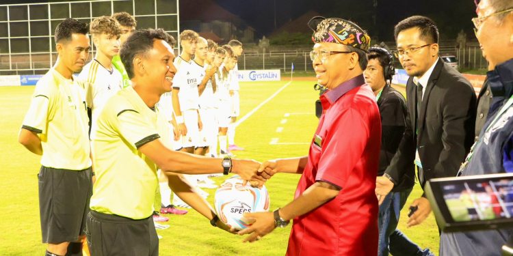 BALIPUSTAKANEWS, DENPASAR – Keberpihakan Gubernur Bali, Wayan Koster terhadap dunia olahraga sepak bola diapresiasi Chairman Pancoran Soccer Field (PSF), Gede Widiada saat Ketua DPD PDI Perjuangan Provinsi Bali secara langsung membuka International Youth Championship (IYC) 2023 di Stadion I Gusti Ngurah Rai, Denpasar yang ditandai dengan dimulainya pertandingan antara Real Madrid CF U – 20 (Spanyol) vs Kashima Antlers FC U-20 (Jepang) pada, Senin (Soma Kliwon, Kuningan) 7 Agustus 2023 malam. Pertandingan perdana IYC 2023 tersebut dimenangkan oleh Real Madrid dengan skor kemenangan 5 – 3 atas Kashima Antlers.