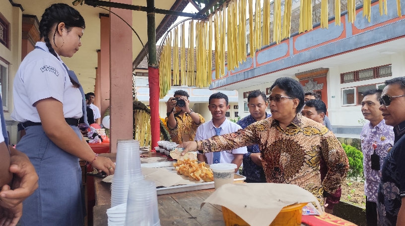 Dalam kunjungannya, Giri Prasta tidak hanya memberikan arahan, tetapi juga menyempatkan diri meninjau pameran kewirausahaan sekolah. Ia tampak antusias berkeliling, memborong produk-produk di stan bazar milik para siswa, dan membagikan kembali barang dagangan tersebut.