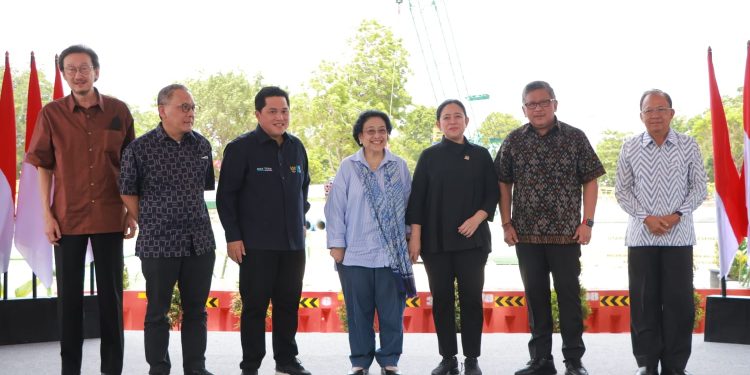BALIPUSTAKANEWS, DENPASAR – Presiden Kelima Republik Indonesia, Ibu Prof. Dr. (H.C.) Megawati Soekarnoputri meninjau pembangunan Kawasan Ekonomi Khusus (KEK) Sanur, Kota Denpasar pada, Senin (Soma Paing, Langkir) 16 Januari 2023 bersama Ketua DPR RI, Ibu Puan Maharani, Menteri Badan Usaha Milik Negara (BUMN) RI, Erick Thohir, Kepala Badan Riset Inovasi Nasional (BRIN), Laksana Tri Handoko, Sekjen PDI Perjuangan, Hasto Kristiyanto, Gubernur Bali, Wayan Koster, Walikota Denpasar, IGN Jaya Negara, dan Bupati Badung, Nyoman Giri Prasta.