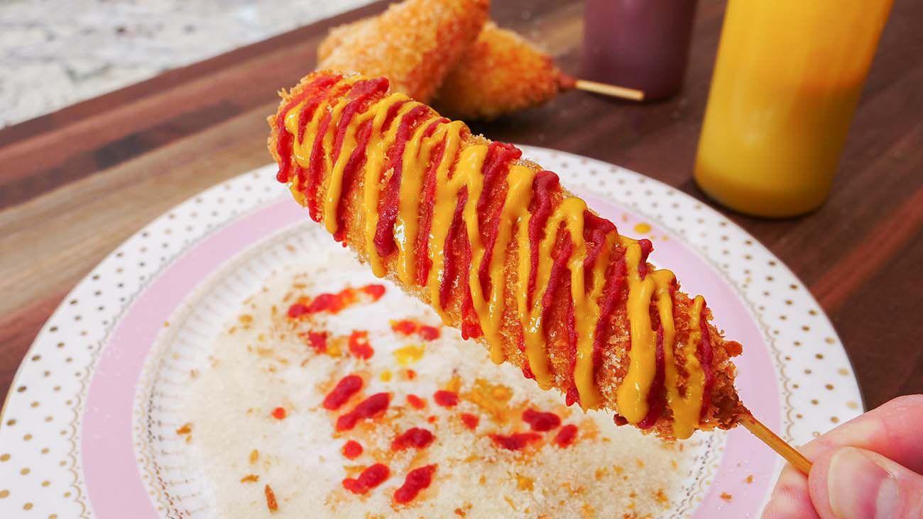 balurkan tusukan tersebut ke dalam tepung roti lalu goreng hingga matang di dalam minyak goreng yang sudah panas di api sedang. Setelah matang, angkat dan tiriskan minyak goreng tersebut. Jajanan Corn Dog dapat dinikmati.