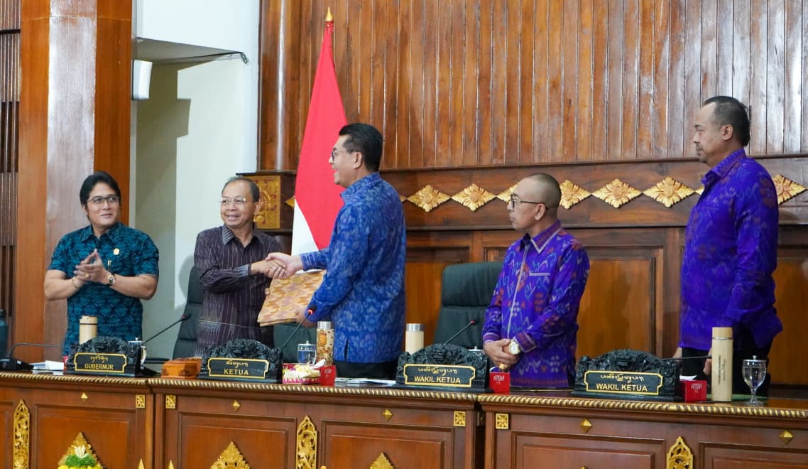 Balipustakanews.com, Denpasar – Gubernur Bali Wayan Koster bersama Wakil Gubernur Nyoman Giri Prasta menghadiri Rapat Paripurna ke-31 Masa Persidangan III Tahun Sidang 2024–2025 di Kantor Gubernur Bali, Senin (11/8). Agenda sidang yang dipimpin Ketua DPRD Bali ini membahas pandangan umum fraksi terhadap Rancangan Peraturan Daerah (Raperda) tentang Bale Kertha Adhyaksa Desa Adat di Bali.