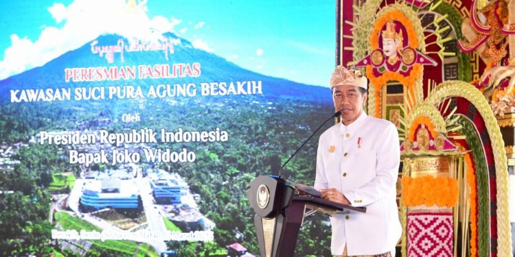 BALIPUSTAKANEWS, KARANGASEM – Presiden Republik Indonesia, Bapak Ir. Joko Widodo didampingi Gubernur Bali, Wayan Koster meresmikan Fasilitas Kawasan Suci Pura Agung Besakih pada, Senin (Soma Pon, Matal), 13 Maret 2023 yang ditandai dengan pemukulan kulkul dan penandatanganan Prasasti di depan Candi Bentar Margi Agung.