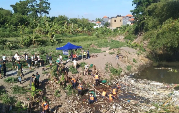 Ratusan relawan bekerja bahu-membahu mengangkat sampah yang menyumbat aliran sungai di Banjar Sasih, Gianyar. Kegiatan ini merupakan bagian dari program pembersihan Sungai Watch yang berfokus pada pengendalian limbah di aliran sungai.