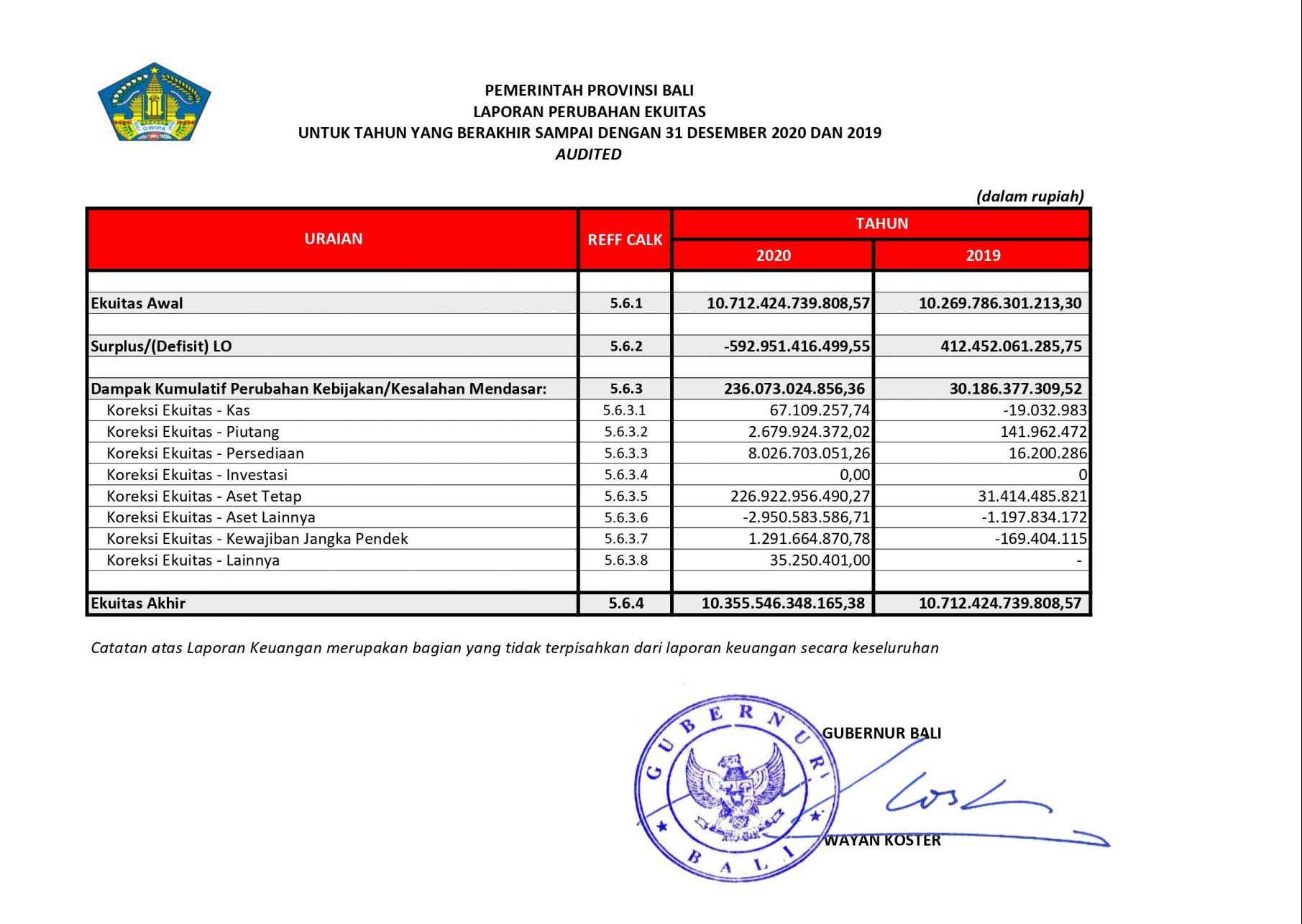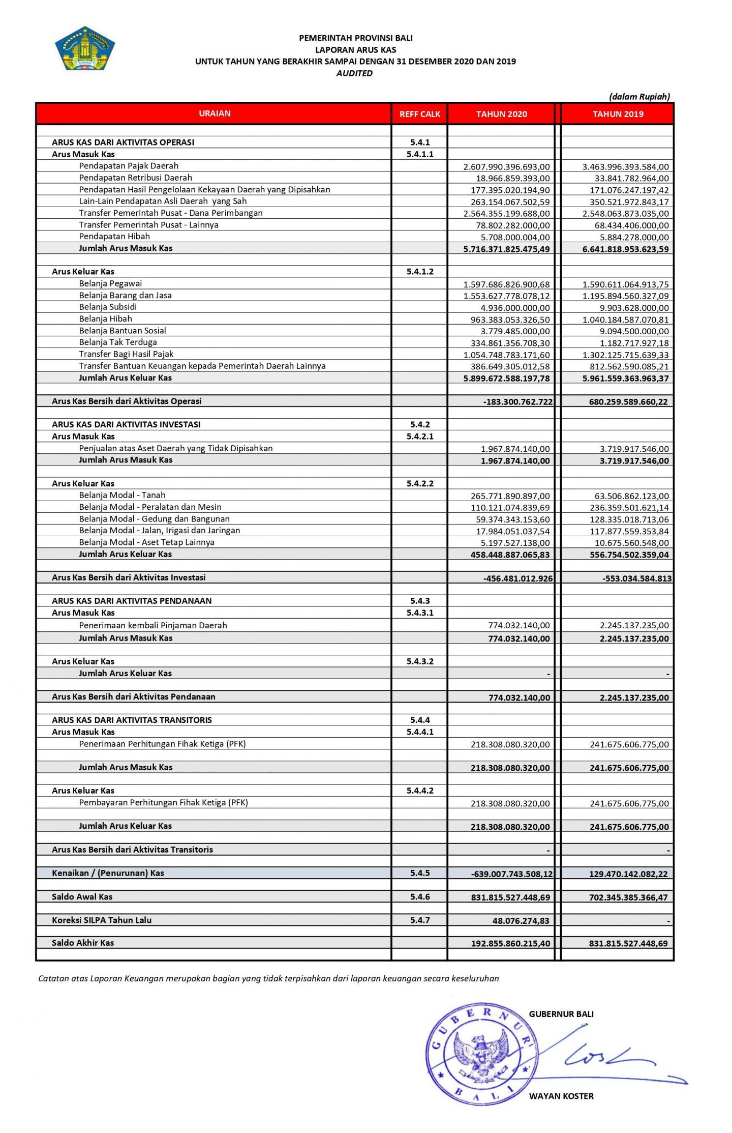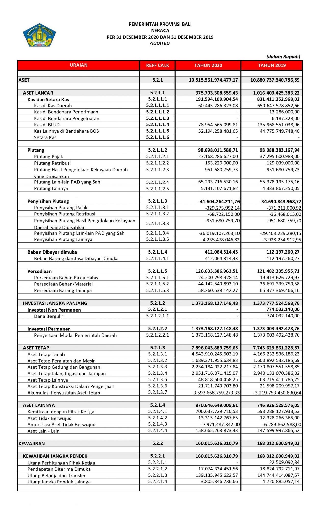 BPK yakin bahwa bukti pemeriksaan yang telah diperoleh adalah cukup dan tepat, sebagai dasar untuk menyatakan opini BPK. Menurut opini BPK, laporan keuangan yang disebut di atas, menyajikan secara wajar, dalam semua hal yang material, posisi keuangan Pemerintah Provinsi Bali tanggal 31 Desember 2020, dan realisasi anggaran, perubahan saldo anggaran lebih, operasional, arus kas, serta perubahan ekuitas untuk tahun yang berakhir pada tanggal tersebut, sesuai dengan Standar Akuntansi Pemerintahan.