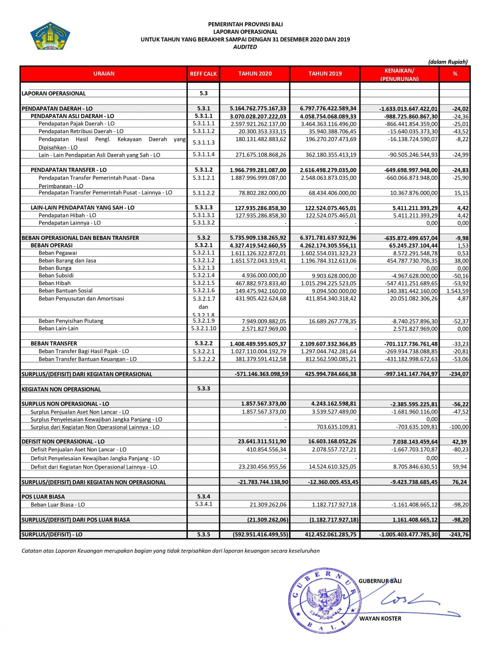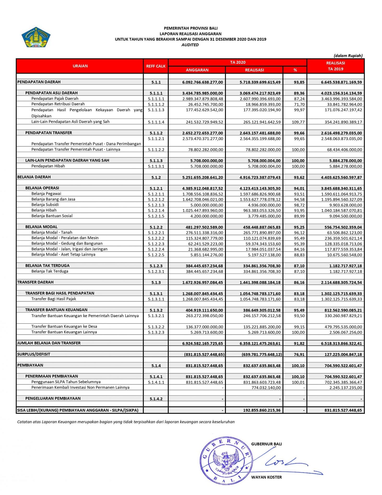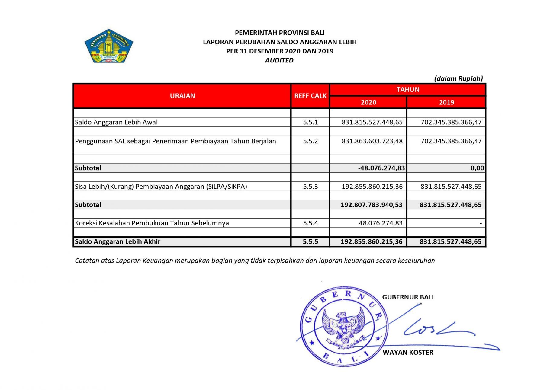 BPK yakin bahwa bukti pemeriksaan yang telah diperoleh adalah cukup dan tepat, sebagai dasar untuk menyatakan opini BPK. Menurut opini BPK, laporan keuangan yang disebut di atas, menyajikan secara wajar, dalam semua hal yang material, posisi keuangan Pemerintah Provinsi Bali tanggal 31 Desember 2020, dan realisasi anggaran, perubahan saldo anggaran lebih, operasional, arus kas, serta perubahan ekuitas untuk tahun yang berakhir pada tanggal tersebut, sesuai dengan Standar Akuntansi Pemerintahan.