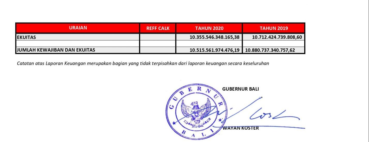 BALIPUSTANEWS – BPK telah memeriksa Laporan Keuangan Pemerintah Provinsi Bali, yang terdiri dari Neraca tanggal 31 Desember 2020, Laporan Realisasi Anggaran, Laporan Perubahan Saldo Anggaran Lebih, Laporan Operasional, Laporan Arus Kas, dan Laporan Perubahan Ekuitas untuk tahun yang berakhir pada tanggal tersebut, serta Catatan atas Laporan Keuangan sesuai dengan Undang-Undang Nomor 15 Tahun 2004 tentang Pemeriksaan Pengelolaan dan Tanggung Jawab Keuangan Negara dan Undang-Undang Nomor 15 Tahun 2006 tentang Badan Pemeriksa Keuangan.