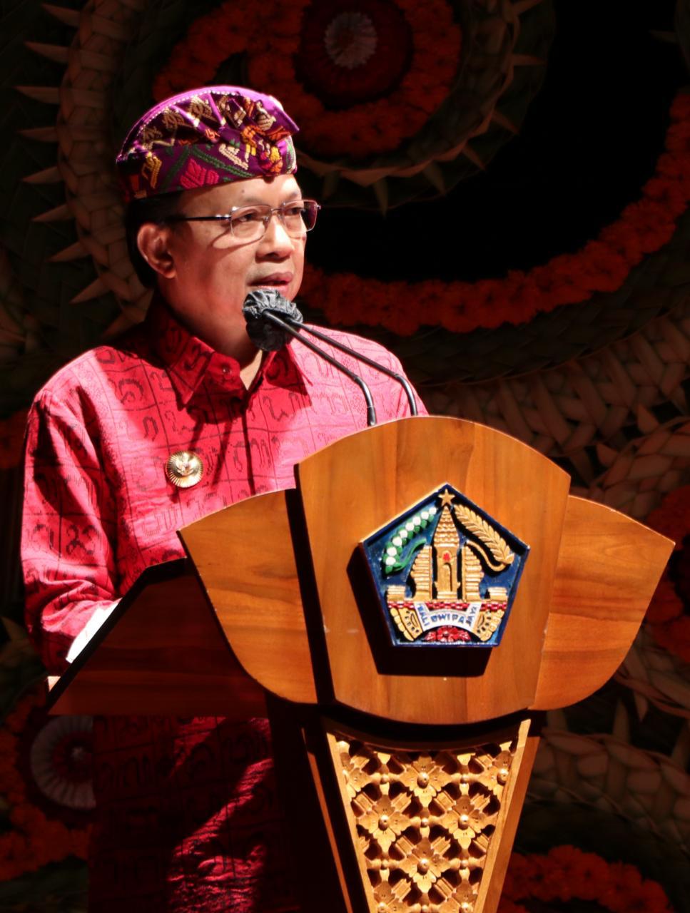 Dalam sambutannya, Gubernur asal Desa Sembiran, Buleleng ini mengatakan Pulau Bali sejatinya tidaklah besar. Tetapi di tempat yang kecil ini kita memiliki Bahasa Bali yang merupakan Bahasa Ibu, begitu juga dengan Aksara Bali yang berperan menuliskan kemuliaan pemikiran para leluhur, dan Sastra Bali yang bisa kita jadikan pedoman kehidupan sekala maupun niskala.