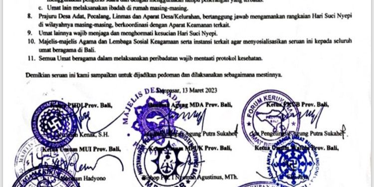Demikian seruan ini untuk dijadikan pedoman dan dilaksanakan sebagaimana mestinya. Seruan Bersama ini ditandatangani oleh Ketua PHDI Bali I Nyoman Kenak, SH, Bendesa Agung MDA Provinsi Bali Ida Pengelingsir Agung Putra Sukahet, Ketua FKUB Bali Ida Pengelingsir Agung Putra Sukahet, Ketua Umum MUI Bali Mahrusun Hadyono, Ketua Mafakin Provinsi Bali Ws Adinatha, Ketua Umum MPUK Provinsi Bali Bishop Pdt. I Nyoman Agustinus, MTh., Ketua Umum Walubi Provinsi Bali Eka Jaya, Keuskupan Denpasar Mgr. Dr. Silvester San, Kakanwil Agama Provinsi Bali Dr. Komang Sri Marheni, S.Ag., M.Si., Komandan Korem 163/Wirasatya Brigjen TNI Choirul Anam, SE, MH. Mengetahui: Kapolda Bali Irjen Pol. Putu Jayan Danu Putra dan Gubernur Bali Wayan Koster.