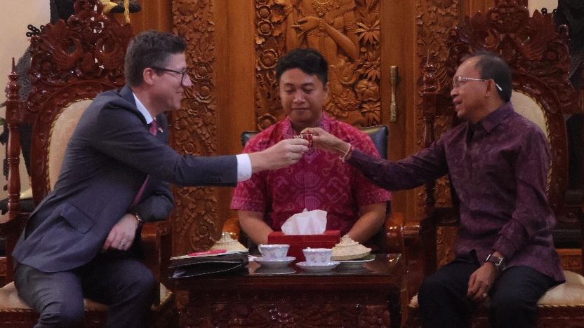 Sebagai penutup pertemuan, Gubernur Koster menyuguhkan kopi khas Bali yang dicampur dengan minuman tradisional arak Bali. Cita rasa unik ini pun menuai pujian dari Mathias Domenig.