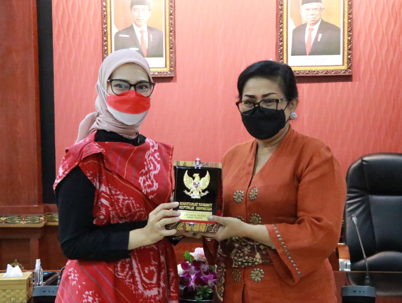BALIPUSTAKANEWS,DENPASAR – Ketua TP PKK Provinsi Bali yang juga sekaligus Ketua Dekranasda Provinsi Bali Ny. Putri Koster menerima kunjungan kerja dari Staf Khusus Presiden RI Angkie Yudistia beserta jajaran di Ruang Wiswa Sabha Madya, Kantor Gubernur Bali, Kamis (7/4)
