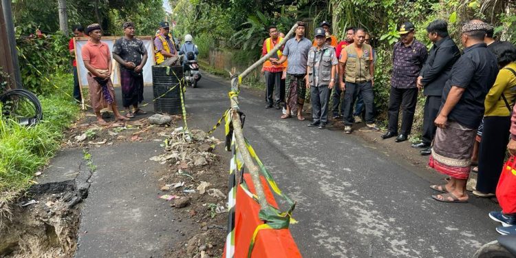 BALIPUSTAKANEWS, GIANYAR – Wakil Gubernur Bali Prof. Tjok Oka Sukawati didampingi Kepala Dinas PUPR Provinsi Bali Nusakti Yasa Weda, Kalaksa BPBD Provinsi Bali Made Rentin, Kepala Dinas PU Kabupaten Gianyar I Dewa Gede Putra Hartawan, Kalaksa BPBD Kabupaten Gianyar Ida Bagus Putu Suamba meninjau jalan penghubung Ubud dan Tegalalang yang longsor sejak 7 Juli 2023.