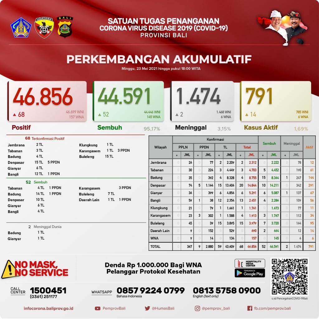 Update Covid-19 Bali 23 Mei 2021,Kasus Sembuh 52 & Kasus Baru 68 Orang