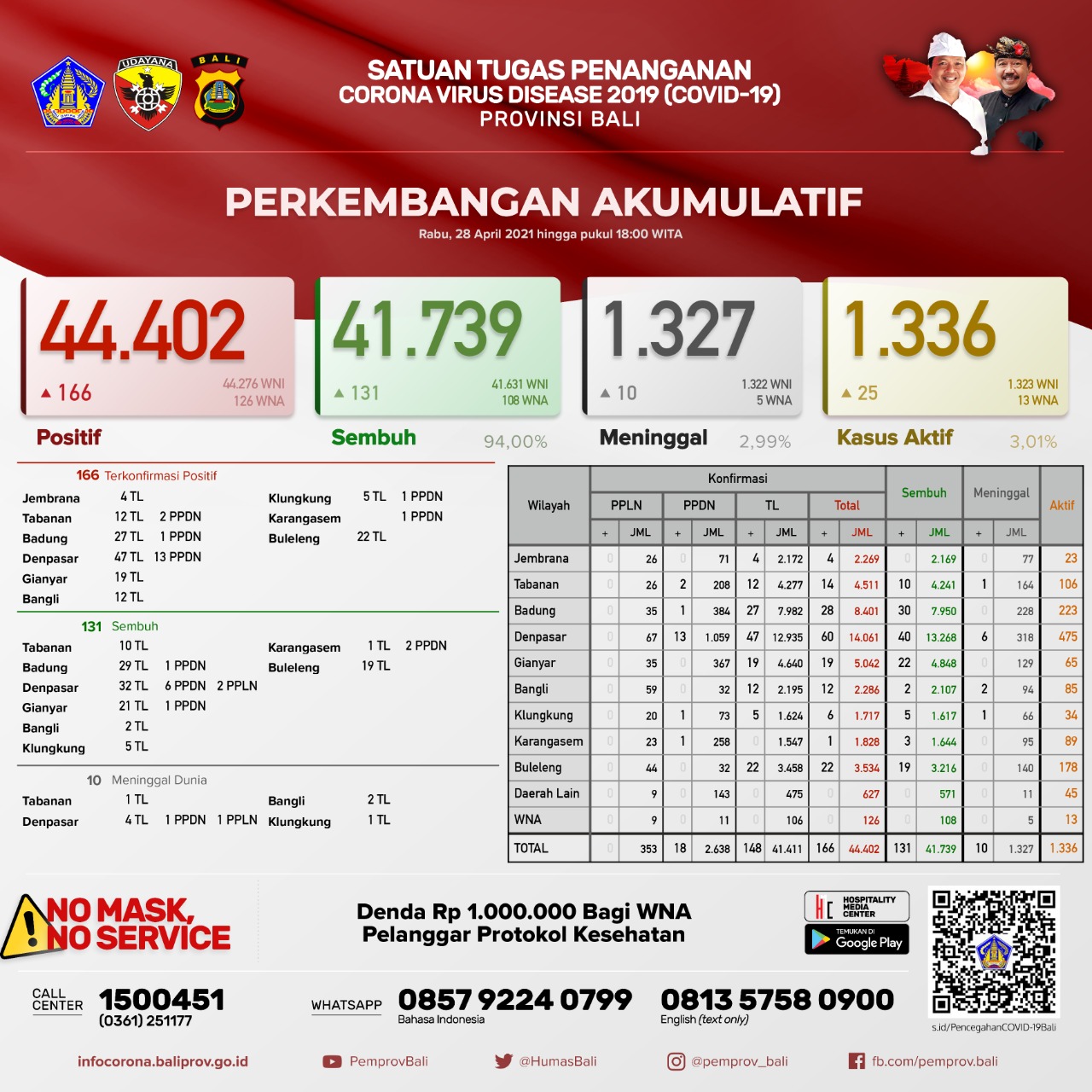 Jumlah kasus secara kumulatif , TERKONFIRMASI 44.402 orang, SEMBUH 41.739 orang (94,00%), dan Meninggal Dunia 1.327 orang (2,99%). Kasus Aktif per hari ini menjadi 1.336 orang (3,01%).