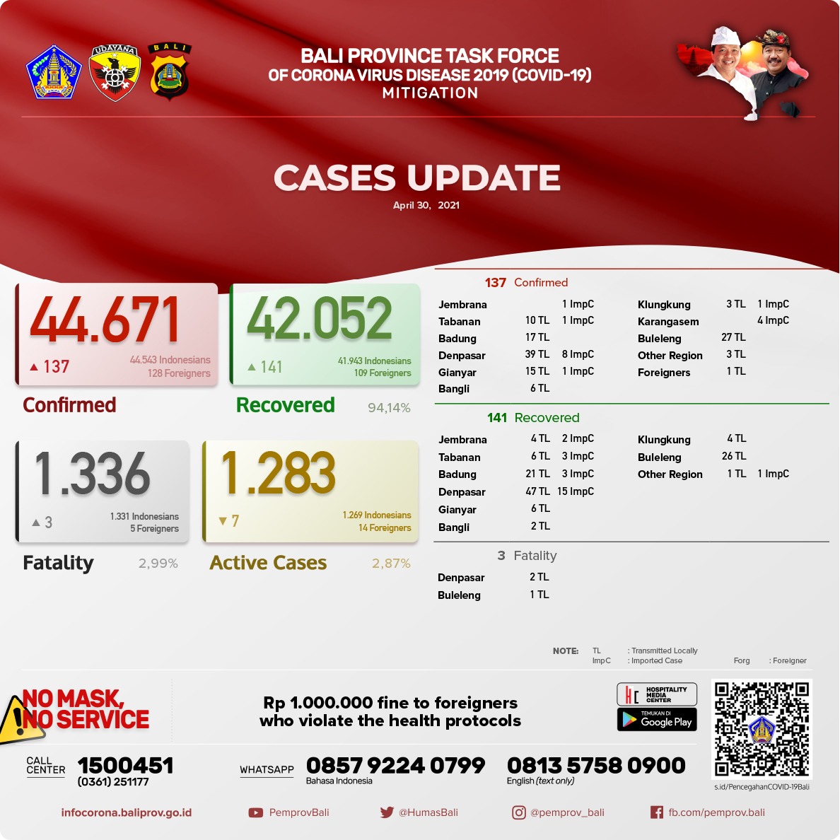 BALIPUSTAKANEWS,DENPASAR – Pertambahan kasus hari ini, TERKONFIRMASI sebanyak 137 orang (121 orang melalui Transmisi Lokal dan 16 PPDN) SEMBUH sebanyak 141 orang, dan 3 orang Meninggal Dunia.