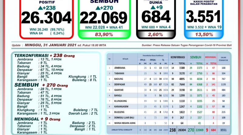 BALIPUSTAKANEWS,DENPASAR – Perkembangan Pandemi Covid-19 di Provinsi Bali per hari ini mencatat pertambahan kasusTERKONFIRMASI sebanyak 238 orang (214 orang melalui Transmisi Lokal dan 24 PPDN), SEMBUH sebanyak 270 orang, dan 9 orang Meninggal Dunia. Jumlah kasus secara kumulatif sebagai berikut : Terkonfirmasi Positifย 26.304 orang, Sembuh 22.069 orang (83,90%), danย Meninggal Dunia 684 orang (2,60%). Kasus Aktif per hari ini menjadi 3.551 orang (13,50%).