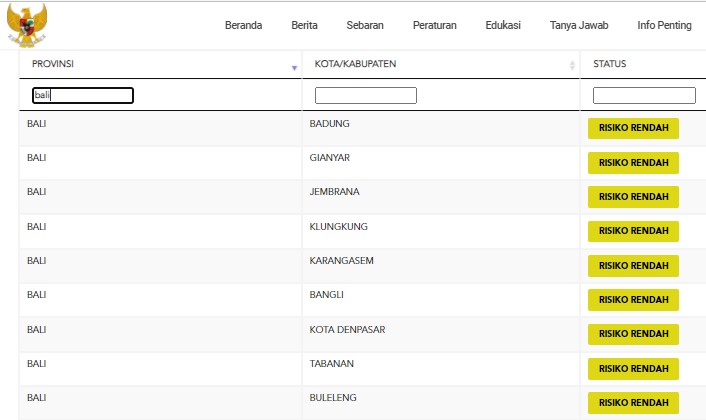 Seluruh Kabupaten / Kota berada pada Zona Kuning / Risiko Rendah (8 Kabupaten dan 1 Kota) : Kabupaten Badung, Gianyar, Bangli, Jembrana, Klungkung, Karangasem, Tabanan, Buleleng, dan Kota Denpasar.