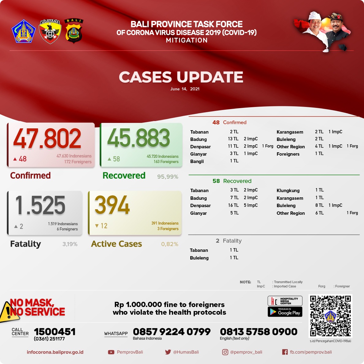 BALIPUSTAKANEWS,DENPASAR – Pertambahan kasus hari ini, TERKONFIRMASI sebanyak 48 orang (39 orang melalui Transmisi Lokal, 7 PPDN dan 2 PPLN), SEMBUH sebanyak 58 orang dan 2 pasien yang meninggal dunia).