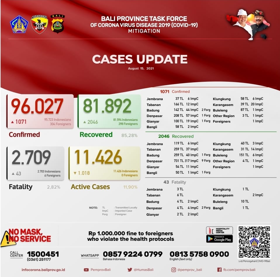 BALIPUSTAKANEWS,DENPASAR – Pertambahan kasus hari ini sebagai berikut, TERKONFIRMASI sebanyak 1.071 orang (898 orang melalui Transmisi Lokal, 169 PPDN dan 4 PPLN), SEMBUH sebanyak 2.046 orang dan 43 pasien meninggal dunia.
