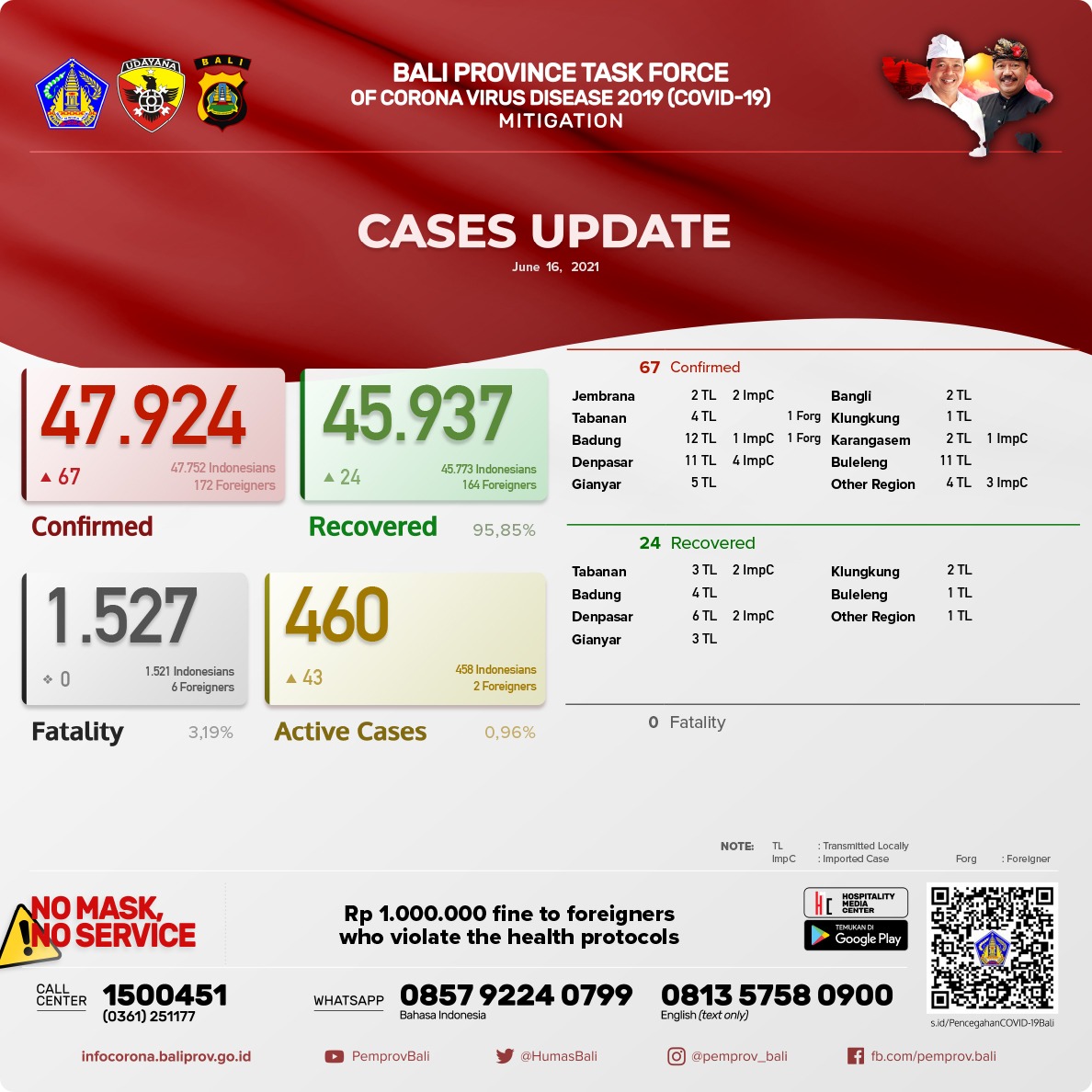 Jumlah kasus secara kumulatif, TERKONFIRMASI 47.924 orang, SEMBUH 45.937 orang (95,85%), dan Meninggal Dunia 1.527 orang (3,19%). Kasus Aktif per hari ini menjadi 460 orang (0,96%).