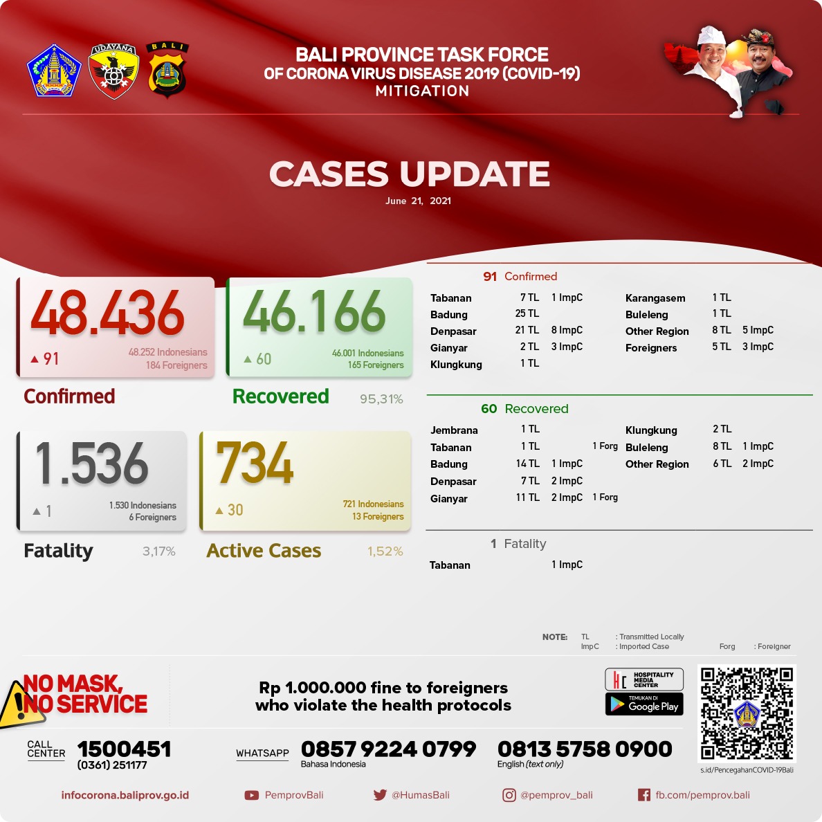 Update kasus Covid 19 Bali 21 Juni 2021, Kasus Sembuh 60 & Kasus baru 91 Pasien