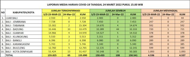 Update Kasus Covid 19 Bali , 24 Maret 2022. Kasus Sembuh 108 & Kasus baru 65 Orang