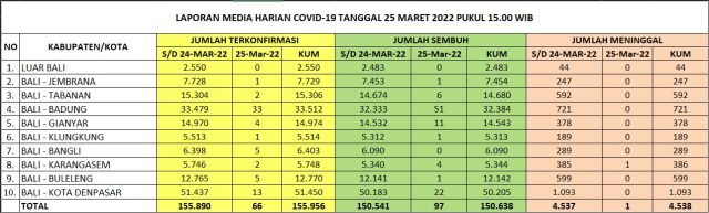 Update Kasus Covid 19 Bali, 25 Maret 2022. Kasus Sembuh 97 & Kasus baru 66 Orang