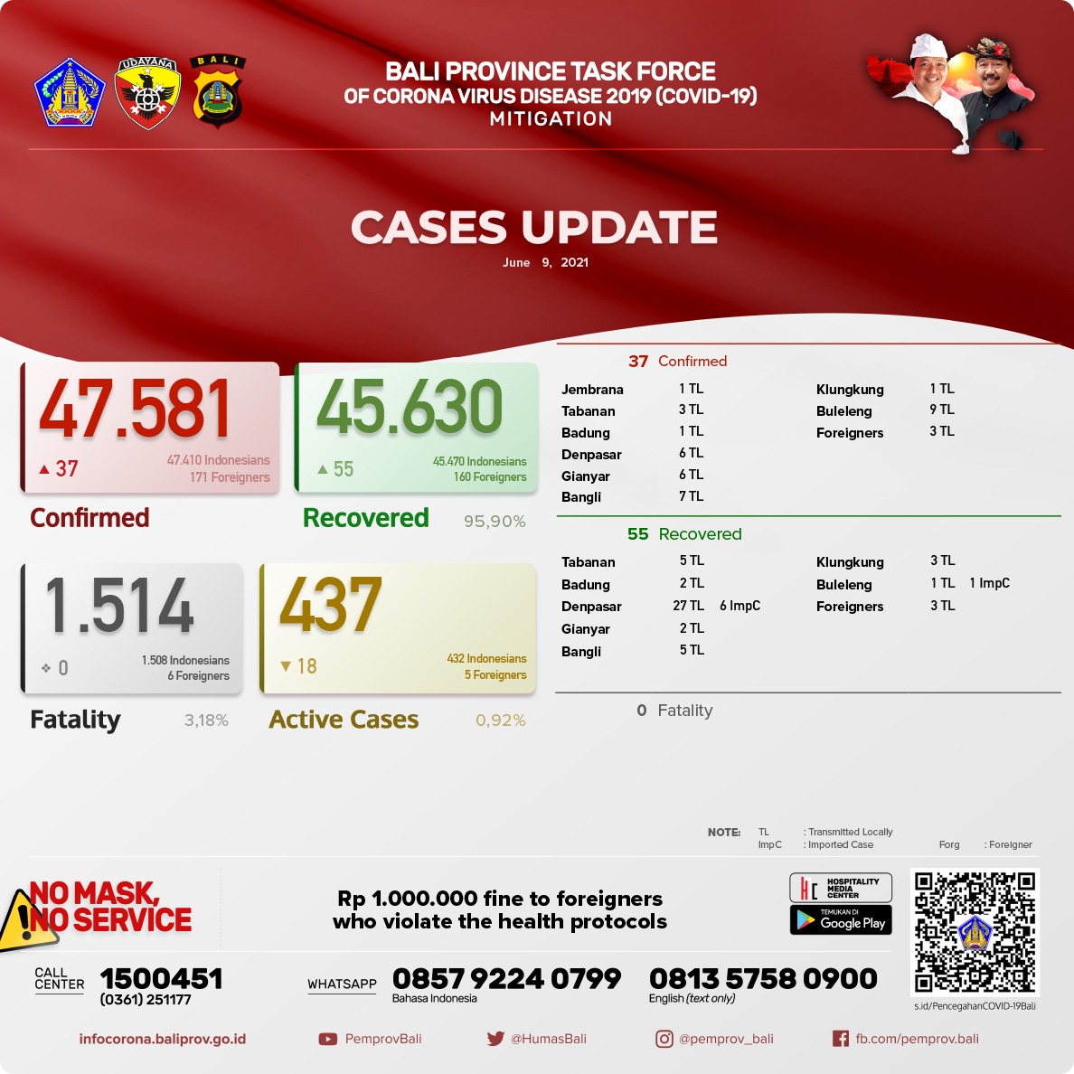 Jumlah kasus secara kumulatif, TERKONFIRMASI 47.581 orang, SEMBUH 45.630 orang (95,90%), dan Meninggal Dunia 1.514 orang (3,18%). Kasus Aktif per hari ini menjadi 437 orang (0,92%).