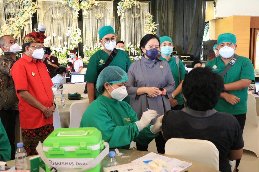 BALIPUSTAKANEWS,DENPASAR – Ketua DPR RI Puan Maharani meninjau pelaksanaan vaksinasi massal di Denpasar, Bali. Vaksinasi yang diikuti para seniman dan masyarakat dari berbagai latar belakang itu mendapat penghargaan MURI.